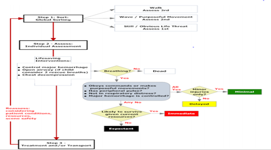 این فرایند با جداسازی کلی بیماران در سه گروه بر اساس دستورهای صوتی ساده آغاز می شود. اولین دستور این است که ” آیا شما می توانید در این محدوده راه بروید؟ ” مصدومینی که می توانند به سمت یک محدوده معین حرکت کنند در سومین گروه برای ارزیابی قرار می گیرند چون نشان دهنده این است که احتمالا علایم حیاتی پایداری خواهند داشت. سپس تریاژ کننده می گوید“ اگر به کمک احتیاج داریدلطفا دست یا پای خود را تکان دهید و من طی چند دقیقه خود را به شما خواهم رساند( دومین گروه ارزیابی). مصدومینی که ساکت و بیحرکت هستند یا شرایط تهدیدکننده حیات از قبیل خونریزی شدید، انسداد راه هوایی و یا کاهش سطح هوشیاری دارند زودتر از دیگران مورد ارزیابی قرار می گیرند( اولین گروه ارزیابی). سپس بعد ار مشخص شدن سه گروه ارزیابی، مصدومین به صورت فردی( ابتدا گروه اول ارزیابی در مرحله اول) بررسی و برچسب گذاری میشوند. در این تریاژ علاوه بر رنگهای استاندارد قبلی شامل قرمز، زرد، سیاه و سبز، از رنگ خاکستری برای بیماران در انتظار که شانس کمی برای بقاء داشته ولی هنوز زنده اند استفاده می گردد. اقداماتی که در این تریاژ توصیه می شود شامل بازکردن راه هوایی، کنترل خونریزی خارجی، تزریق آنتی دوت برای برخی مسمومیت ها و توراکوستومی سوزنی برای پنوموتوراکس فشارنده می باشد.